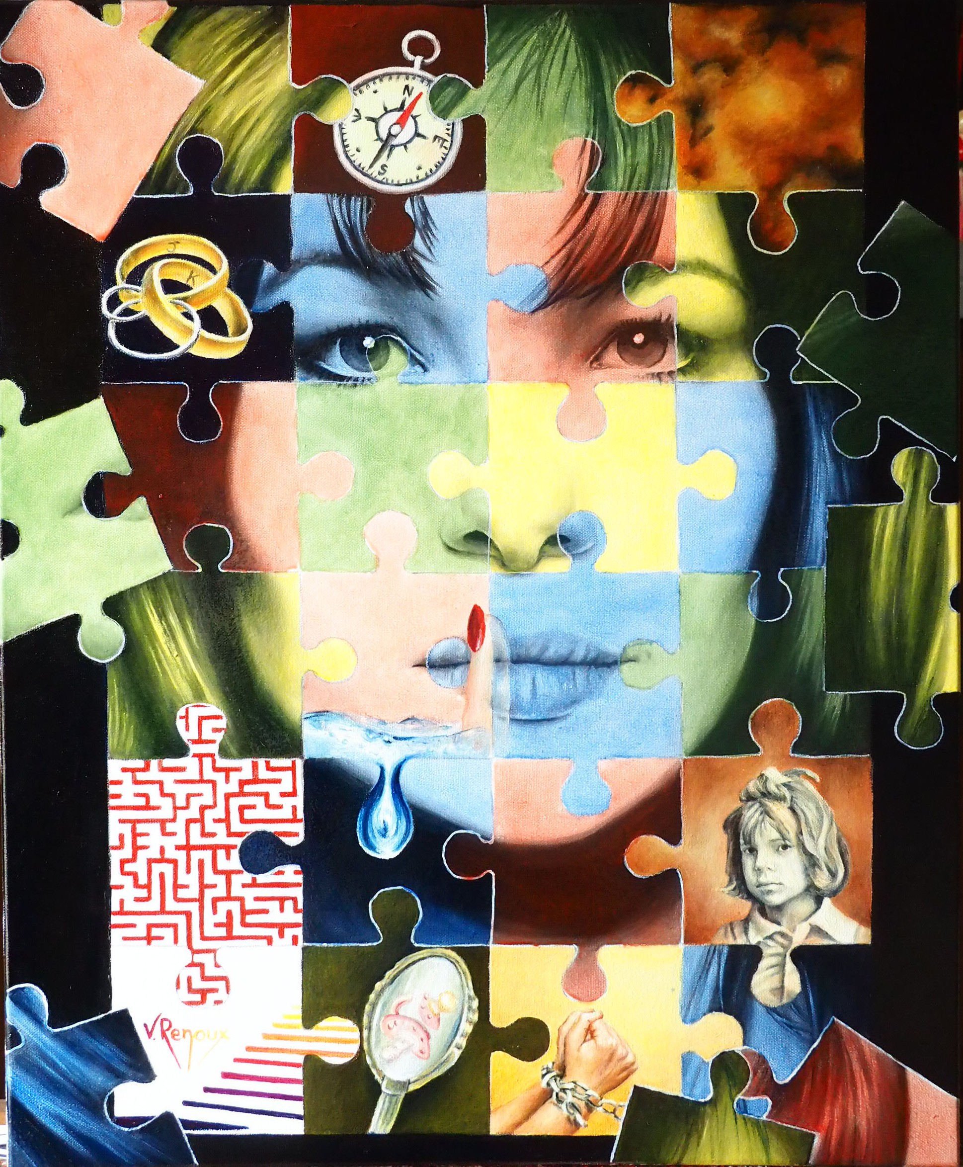 L’éloge de la vieillesse. Acrylique 100 x 100. Le texte écrit dans ses rides raconte sa vie… Voir détails sur : http://www.valerierenoux.com/pages/content/details.html